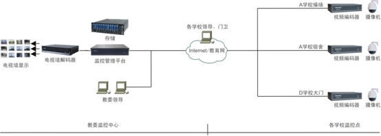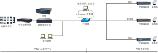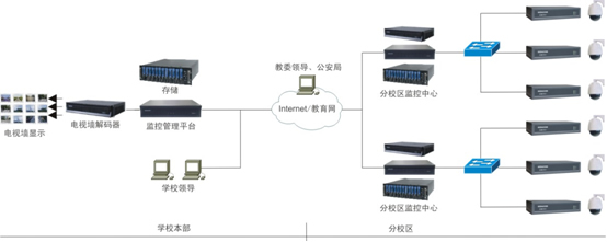 大多高校、部分中學(xué)的監(jiān)控規(guī)模大,且本身即為投資主體,因此通常采用以自身為中心的組網(wǎng)架構(gòu)。門衛(wèi)作為監(jiān)控中心,配置管理平臺(tái)、存儲(chǔ)以及電視墻,監(jiān)控點(diǎn)位于各教學(xué)樓、宿舍、食堂、圖書館、操場(chǎng)、車庫(kù)等場(chǎng)所。監(jiān)控點(diǎn)與平臺(tái)之間通過校園網(wǎng)相連。學(xué)校領(lǐng)導(dǎo)可通過PC訪問監(jiān)控圖像,教委領(lǐng)導(dǎo)可通過Internet或教育網(wǎng)遠(yuǎn)程訪問監(jiān)控圖像。組網(wǎng)方式如下圖所示。